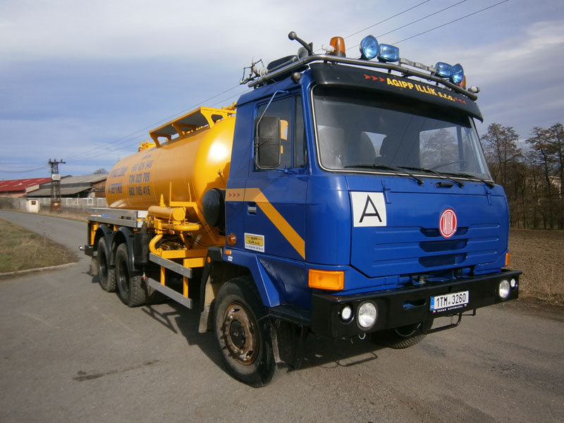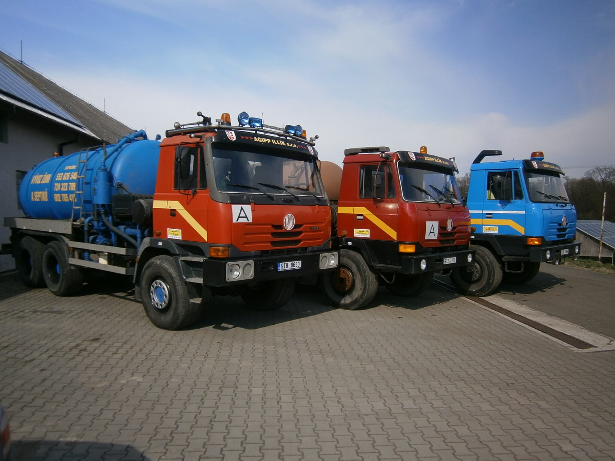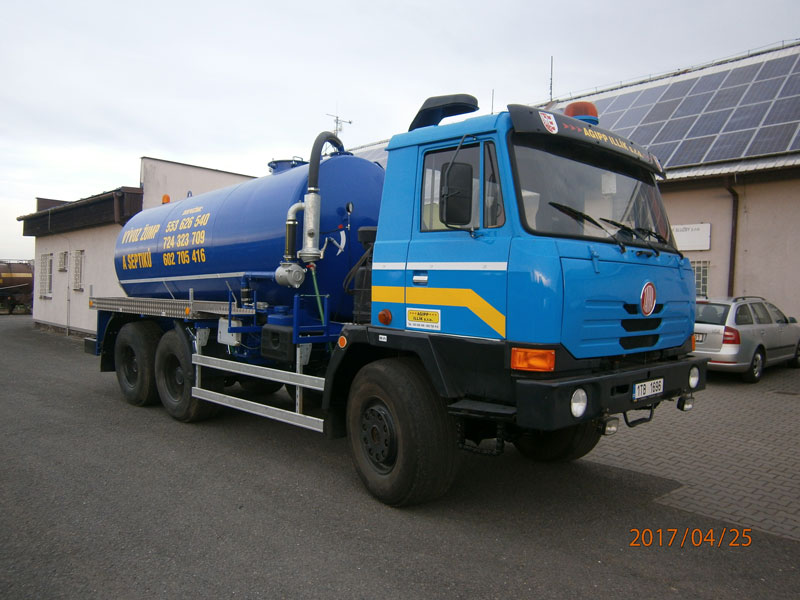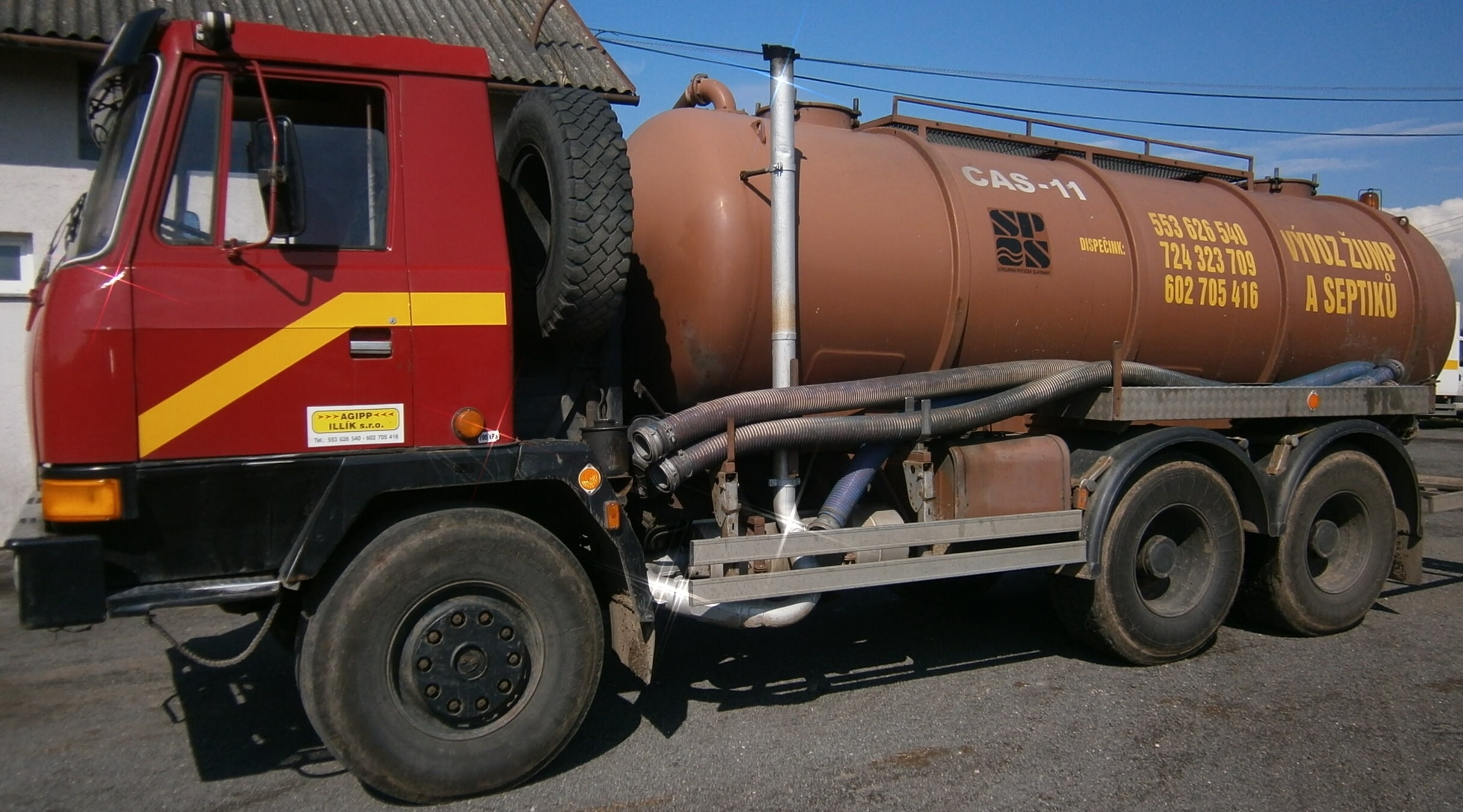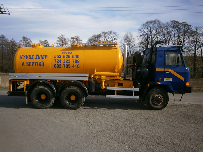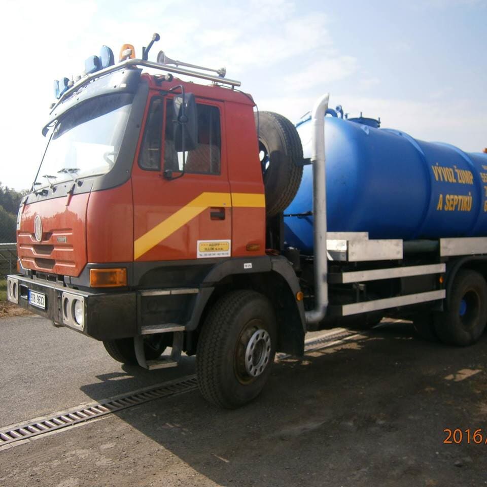 Odvozy zajišťujeme třemi fekálními vozy TATRA 815, CAS 11 o objemu 11m3. Jsme schopni čerpat běžně do vzdálenosti 30m od septiku, ale řešíme individuálně i delší vzdálenosti a to do hloubky až 6m. Máme různé druhy nástavců a přechodek na hadice. V některých situacích jsme schopni řešit vybrání odpadních vod až do hloubky 10m kalovým čerpadlem.